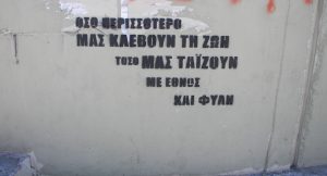 Αυτός ο σύγχρονος φασισμός οικοδομήθηκε σταδιακά μέσα στις προηγούμενες δεκαετίες αποκτώντας σιγά-σιγά την κοινωνική συναίνεση. Αυτός ο σύγχρονος φασισμός χρειάστηκε τους νεοναζί στο ρόλο του «λαγού» για να επιταχυνθεί ο ρυθμός προσαρμογής του κοινωνικού σώματος στις νέες συνθήκες, στην νέα «κανονικότητα». Ο νεοναζιστικός «λαγός» τίμησε το συμβόλαιό του, λειτουργώντας προς όφελος τόσο του κράτους, όσο και του κεφαλαίου που τον χρηματοδότησε και τον προωθούσε επικοινωνιακά. Παράλληλα αυξανόταν σταδιακά και η προπαγάνδα της εκκλησίας, που προωθώντας τα πατριαρχικά δόγματα διεκδικούσε (με το αζημίωτο φυσικά…) κομμάτι της διαχείρισης μιας νέας υπο διαμόρφωση κοινωνικής συνθήκης, οπου ο κοινωνικός έλεγχος δεν θα επιτυγχάνονταν πλέον πετώντας ψίχουλα και κόκαλα κάτω από το τραπέζι με το μεγάλο φαγοπότι, αλλα με γενικευμένη πειθάρχηση, με κοινωνική εξαθλίωση, με κατακερματισμό και αποσύνθεση των ταξικών και κοινωνικών αντιστάσεων, μέσω οργανωμένης διάχυσης κυριαρχικών προτύπων και με εμπέδωση ενός γενικευμένου καθεστώτος εξαίρεσης. Η νέα «εθνική ηθική» πλέον πλάθεται με όρους αποδιοπομπαίου τράγου (βλ. αντιμετώπιση οροθετικών γυναικών). Το παραδοσιακό μοίρασμα οικονομικών μικροεξουσιών για την διατήρηση και αναπαραγωγή της κοινωνικής πυραμίδας, λόγω μειωμένων πλέον δυνατοτήτων στο «εθνικό» οικονομικό πεδίο μέσα σε συνθήκες βίαιης καπιταλιστικής αναδιάρθρωσης, συμπληρώνεται με διάχυση ισχυρών δόσεων μικροεξουσιών. Εξουσιών που βασίζονται σε προκαπιταλιστικές κυριαρχικές ιδεολογίες (ρατσισμός, πατριαρχία), ιδεολογίες που ενσωματώθηκαν μεν «λειτουργικά» στο υπάρχον σύστημα ταξικής εκμετάλλευσης, αλλα δεν αποτελούν απότοκο-παράγωγο του καπιταλισμού. Μετανάστες, πρόσφυγες, ρομά, γυναίκες, οροθετικές, τοξικοεξαρτημένοι/ες, ομοφυλόφιλοι/ες, τρανς, είναι κάποιες από τις κατηγορίες «ταυτοτήτων» που προσφέρονται από το καθεστώς για να αναπτυχθεί πάνω τους ο κοινωνικός κανιβαλισμός, κυρίως στην βάση της κοινωνικής πυραμίδας. Γιατί στην νέα συνθήκη του σύγχρονου φασισμού, συνθήκη άρρηκτα συνδεδεμένη με την κερδοφορία του κεφαλαίου και τον ολοκληρωτικό κοινωνικό έλεγχο, ολόκληροι πληθυσμοί «περισσεύουν». Και λόγω της ύπαρξης μερικών χιλιάδων πυρηνικών κεφαλών στα οπλοστάσια αρκετών κρατών, πιθανόν να μην είναι πλέον εφικτός ένας παγκόσμιος πόλεμος μαζικής καταστροφής κεφαλαίου και θανάτωσης ολόκληρων πληθυσμών, με πιστή αναπαραγωγή των όρων του ιστορικού παρελθόντος…