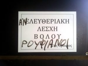 Την Δευτέρα 23 Σεπτέμβρη νωρίς το πρωί διαπιστώσαμε ότι η πινακίδα της Λέσχης στην είσοδο του κτιρίου είχε γραφτεί. Δεν ήταν φασιστικά συνθήματα, στοχάδια κλπ όπως θα ήταν το πιο πιθανό και αναμενόμενο. Ήταν «άλλου τύπου» επίθεση, με πολύ συγκεκριμένο και δηλωτικό περιεχόμενο. Σκοπός δεν ήταν απλά να μουτζουρωθεί η πινακίδα ώστε να μην διαβάζεται. Ήταν να δηλωθεί ότι δεν είμαστε ελευθεριακοί/ές αλλά ρουφιάνοι. Αυτή η συγκεκριμένη «ρητορική» της ρουφιανολογίας χρησιμοποιείται συστηματικά εναντίον συντρόφων και συντροφισσών, ανάμεσα τους και συντρόφισσες/οι μέλη της διαχειριστικής συνέλευσης της Ελευθεριακής Λέσχης Βόλου, εδώ και πάνω από 3 χρόνια σε παρέες και στέκια, από συγκεκριμένους «κινηματικούς» μικροηγεμόνες και πολιτικούς χαμαιλέοντες της πόλης.