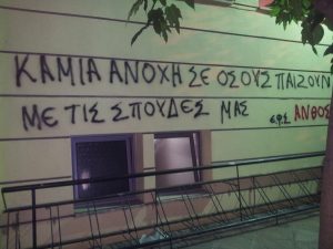 Σε ένδειξη αλληλεγγύης στον αναρχικό κομμουνιστή Τάσο Θεοφίλου, αναρτήθηκαν προπαγανδιστικά πανό της υπόθεσης, στην είσοδο της πόλης και σε πανεπιστημιακά κτίρια (αρχιτεκτονική και κεντρικό κτίριο “Θόλος”).